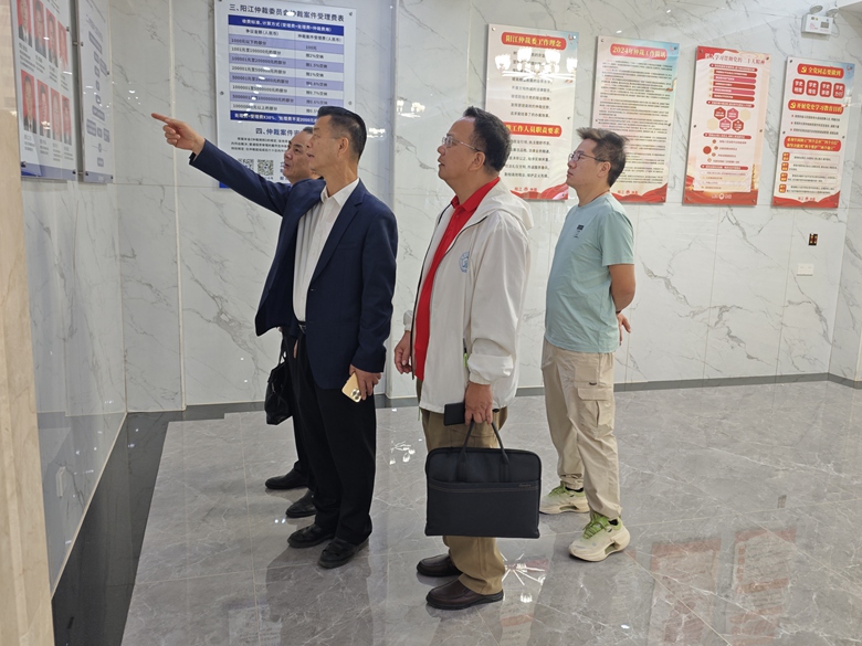 李宗想陪同洪成权一行参观了立案室、仲裁庭等设施,介绍了硬件建设、窗口服务及庭审规范等方面的经验。洪成权对阳江仲裁委高效专业的办案环境给予高度评价。